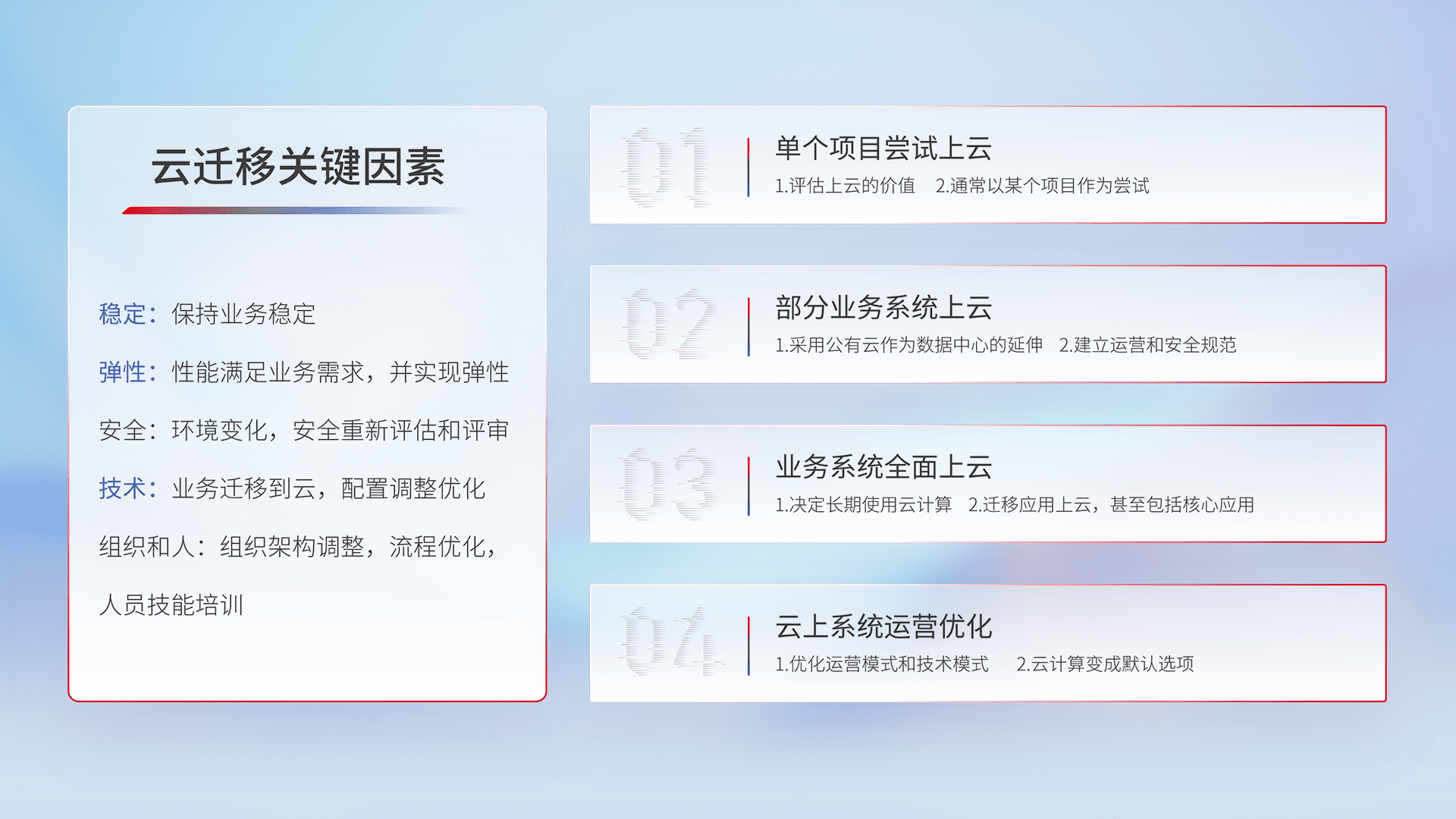 结合实际业务,,,,从规划设计、、云平台选型、、云原生改造、、、、数据迁移、、集成交付,,迁移全过程为客户识别最佳上云路径,,,,做好风险识别管理,,,设计网络架构、、身份权限、、、安全审计合规、、、、操作审计、、日志审计、、监控告警策略、、、、多站点容灾设计等,,,对云上基础设施进行整体规划,,,提升IT治理水平,,,以满足弹性、、、高可用、、、、高性能的需求。。。。