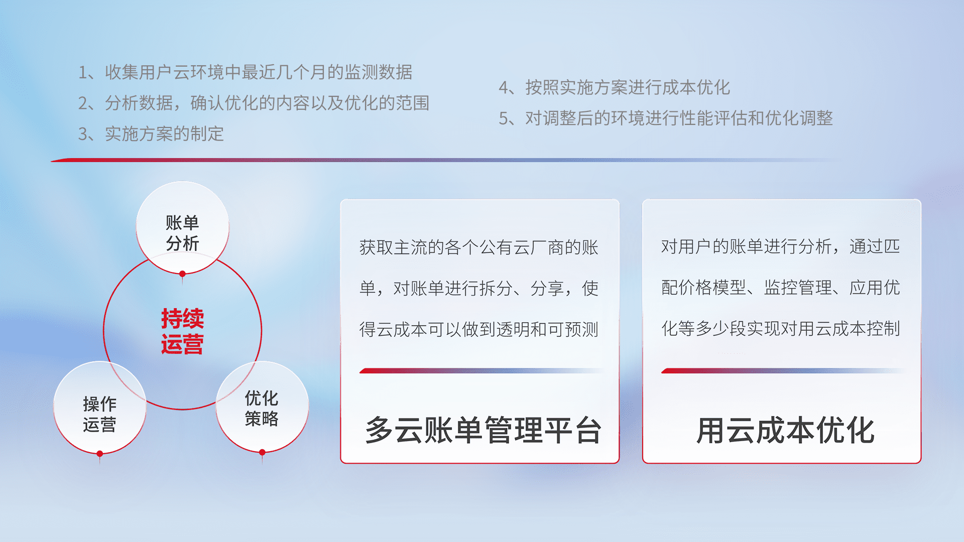 通过多云纳管,,,,以统一的资源数据模型把客户的云资源进行抽象和封装,,进而实现对多云资源的统一操作,,,保障云资源管理的可靠性、、、、稳定性与可用性。。。量身定制化运维内容,,,,配置、、开发运维、、、补丁管理、、备份、、、监控、、、认证和访问管理、、、、审计和日常巡检等,,,保障在用云过程中的可靠度,,稳定度以及高可用率。。。。